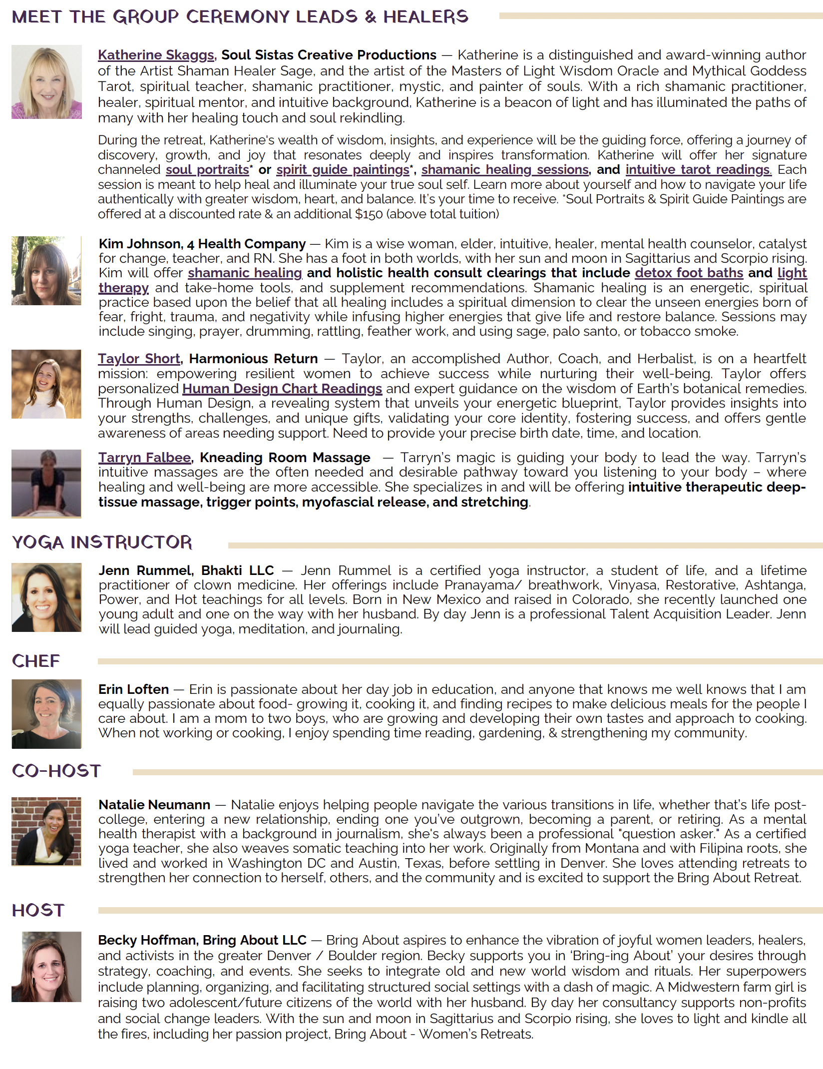 Join together with like-minded and like-hearted women seeking sanctuary of the heart and soul. The Fall Harvest Women’s Retreat, Healing with Our Ancestors is a sacred container for women to deepen into their heart-spaces provided by facilitator/spiritual teachers Katherine Skaggs (author of the multi-award-winning spiritual guidebook Artist Shaman Healer Sage: Timeless Wisdom, Practices, Ritual, and Ceremony to Transform Your Life and Awaken Your Soul) and Kim Johnson (wise woman, elder, catalyst for change, and so much more,) and Bring About Women’s Retreats with Becky Hoffman… and of course a beautiful council of wise women listed below.