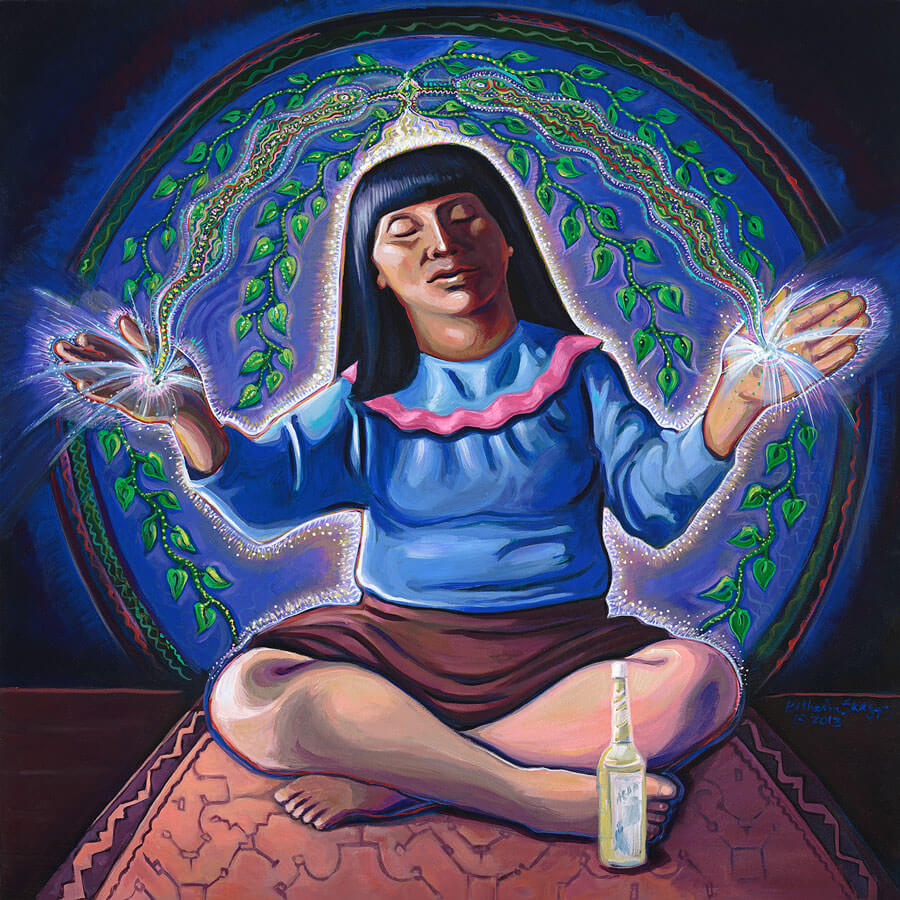 This painting of Herlinda is a representation of her magic, and the illumination of light that comes from singing the powerful, healing icaros, or sacred songs. In this image, as she sings, light molecules flow from her hands in the shape of snakes, representing the power of the anaconda, and of the Great Mother healing vine of the soul, Grandmother Ayahuasca. Healing light pours from her hands radiating this healing energy outward for all to receive. The leaves surrounding her are chacruna leaves, a plant known for activating vision.